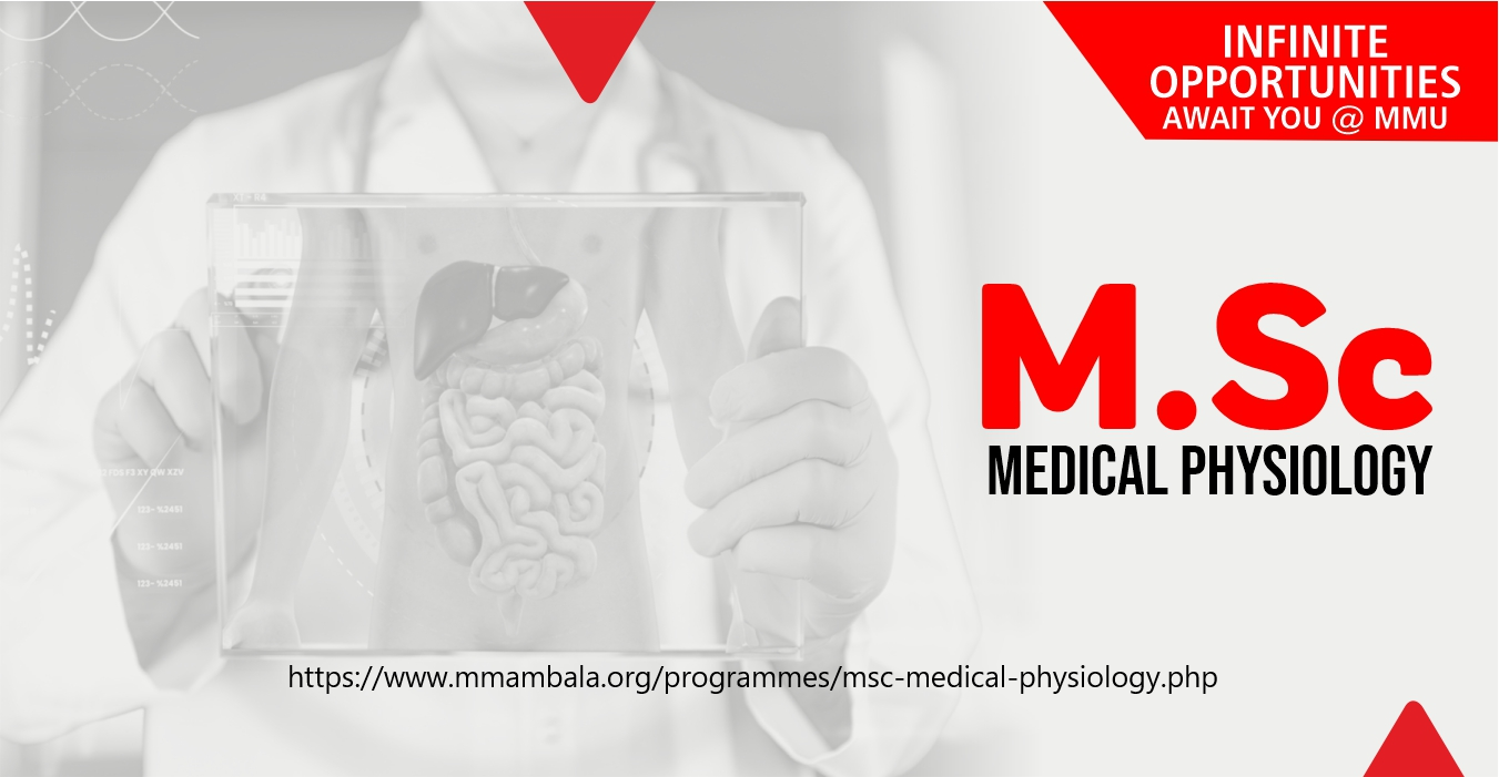 Gain deeper knowledge of the intricacies of human physiology with MMU Ambala's M.Sc https://www.mmambala.org/programmes/msc-medical-physiology.php. Medical Physiology program. This 3-year program offers a comprehensive study of physiological processes, including cellular and organ system functions. Students engage in both theoretical learning and practical laboratory work, exploring topics such as cardiovascular, respiratory, and neurophysiology